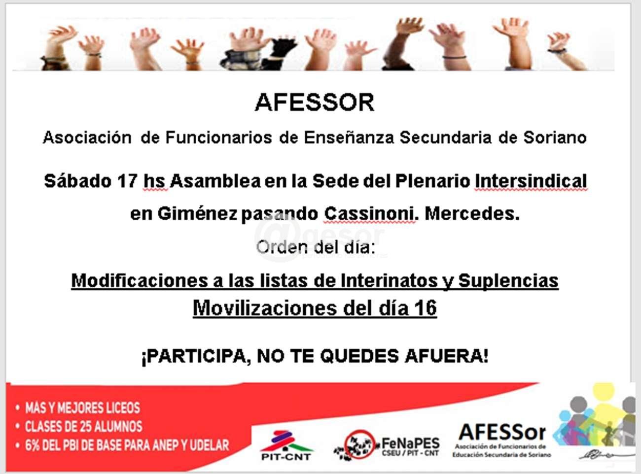 Sábado 17 hs Asamblea en la Sede del Plenario Intersindical en Giménez pasando Cassinoni. Mercedes.
