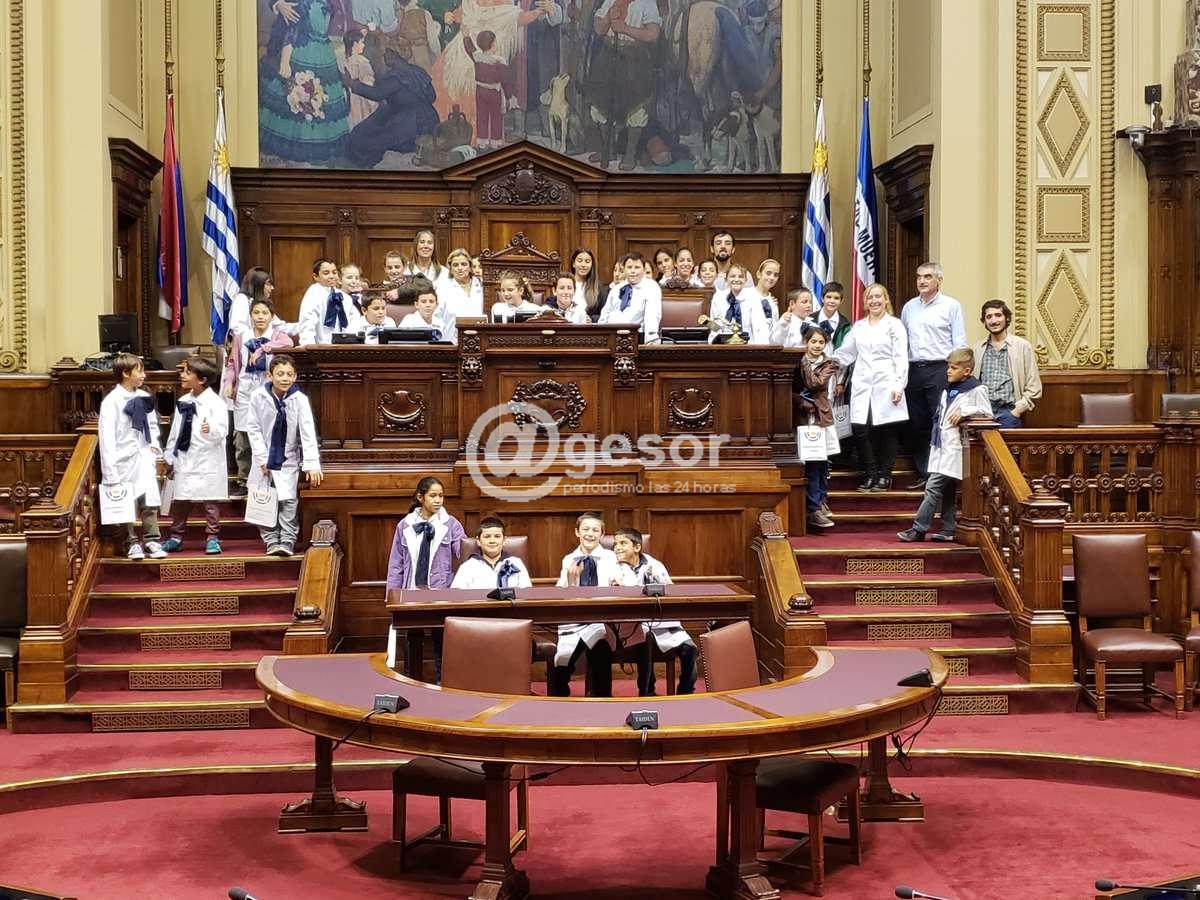 “Túnicas blancas en la Cámara de Representantes. Nos visitaron alumnos, maestras y padres de las Escuelas N°44 de Egaña y N°48 de Risso, departamento de Soriano. Conocieron el hemiciclo y el despacho del Presidente Jorge Gandini”, informa la Cámara de Diputados en su cuenta de Twitter.