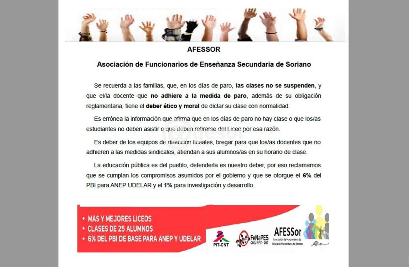 Se recuerda a las familias, que, en los días de paro, las clases no se suspenden, y que el/la docente que no adhiere a la medida de paro, además de su obligación reglamentaria, tiene el deber ético y moral de dictar su clase con normalidad.