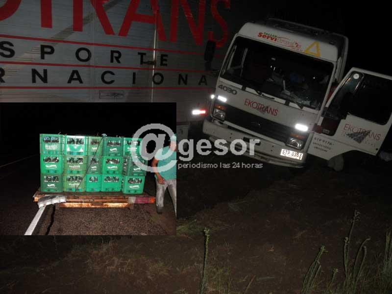 Afortunamente no hubo lesionados, constatándose también que en la maniobra brusca el camión rozó a un trailer que trasladaba casilleros de envases de agua de una empresa de la ciudad de Mercedes, provocando que estos se cayeran como lo muestra otra de las fotos de @gesor.