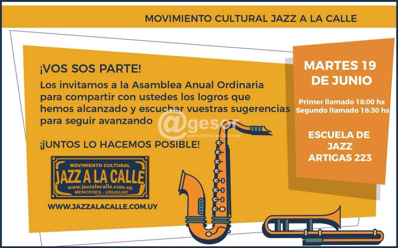 El Movimiento Cultural Jazz a la Calle convoca a la asamblea anual ordinaria a realizarse este martes 19 de junio de 2018 en la Escuela de Jazz a la Calle, Artigas 223