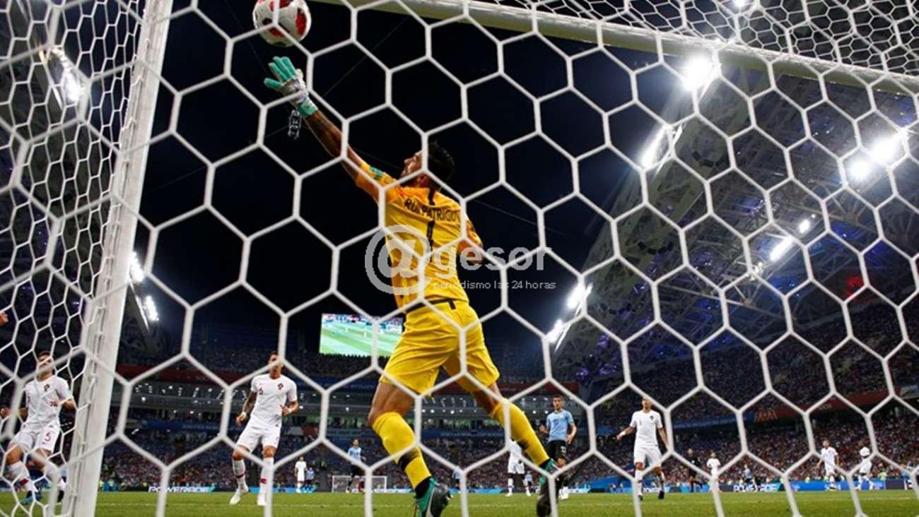 En un encuentro cuyo trámite se marcó por el tempranero golazo de Cavani en una jugada que inició él, con un pelotazo cambiando de derecha a izquierda todo el ancho de la cancha para Luis Suárez y éste tras el control y encarar a un rival pone el centro pase para Cavani que mitad cara y mitad hombro la metió junto al caño izquierdo de Rui Patricio para poner el 1 a 0, iban solamente 7 minutos.