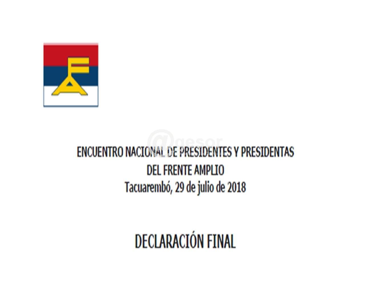 El pasado domingo los presidentes de las 19 Mesas Departamentales del Frente Amplio se reunieron en Tacuarembó. Se trata la segunda reunión y de la que participó el Presidente del Frente Amplio, Esc. Javier Miranda. En la misma se abordaron diferentes temas de la actualidad política nacional y de la región, emitiendo un comunicado que entre otros conceptos expresa: “Nos comprometemos a generar las condiciones que aseguren la igualdad entre hombres y mujeres en la participación militante y representativa del Frente Amplio, promoviendo la participación de las mujeres en todos los ámbitos, en especial, en los ámbitos de definición, siendo coherentes con las resoluciones adoptadas por nuestro Plenario Nacional”.
