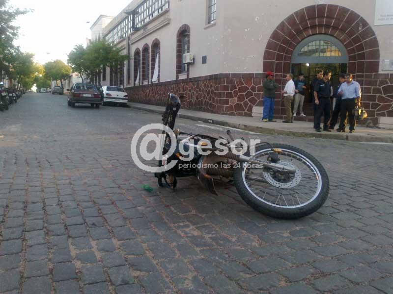(por Martín Corujo) Un auto y una moto colisionaron en la esquina de la Escuela Técnica "Pedro Blanes Viale", en Haedo y Ferrería de la ciudad de Mercedes. El accidente fue protagonizado por el automóvil Renault KMA 3068, conducido por Osvaldo Ariel Crosi y la moto Yumbo 125 cc. KMW 379, guiada por Julio César González. De acuerdo a la información extraoficial recogida en el lugar, el vehículo menor transitaba por Ferrería al este, mientras que el restante lo hacía por calle Haedo al sur, como lo muestra la fotografía. Si bien Policía Técnica trabajó en el lugar junto a personal de la Brigada de Tránsito, se trataron de establecer las causas del siniestro. En cuanto a lesiones, la peor parte se la llevó el conductor de la moto, quien habría sufrido fractura de tibia y peroné, siendo trasladado de inmediato por una emergencia móvil que lo derivó a un centro asistencial.