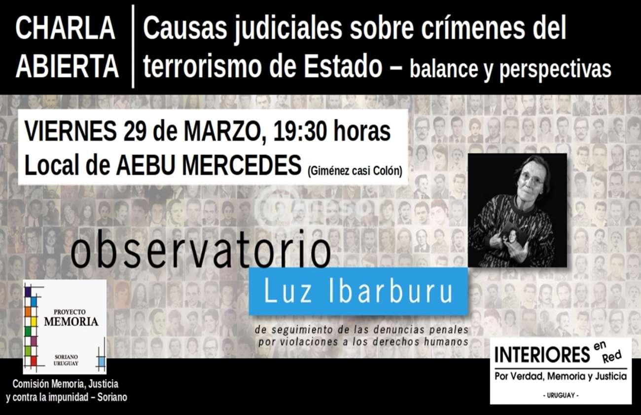 La Comisión Memoria, Justicia y contra la impunidad de Soriano organiza una nueva actividad. Se trata de una charla abierta del Observatorio Luz Ibarburu sobre las causas judiciales del terrorismo de Estado, balance y perspectiva.
