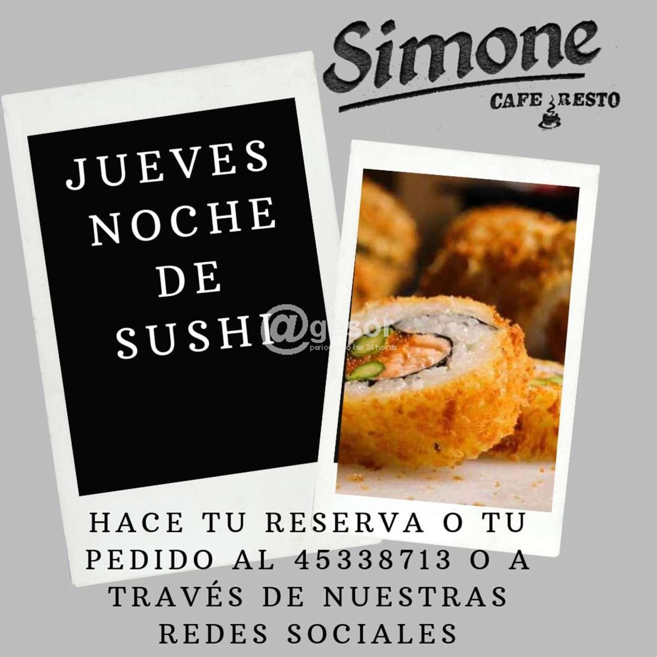 Este jueves SIMONE CAFE & RESTO te invita a una noche de SUSHI, para lo que podés hacer tu reserva o tu pedido a través del tel. 4533 8713 o a las redes sociales.