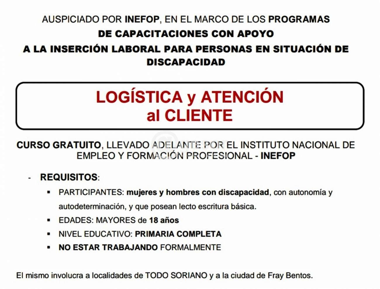 Auspiciado por INEFOP, en el marco de los programas de capacitaciones con apoyo a la inserción laboral para personas en situación de discapacidad, se invita a participar del curso de Logística y Atención al Cliente, que es gratuito, llevado adelante por el INEFOP.