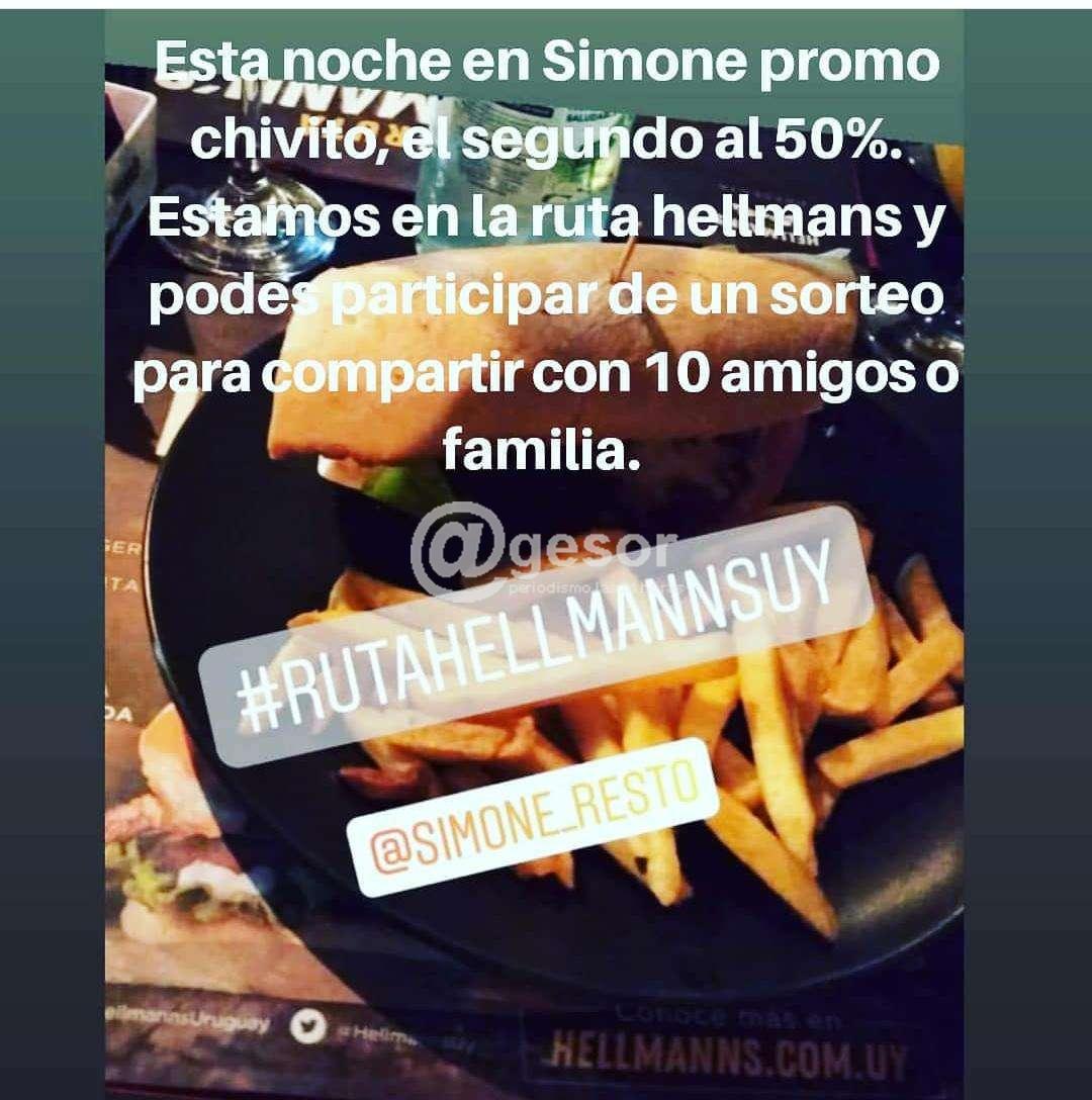 Esta noche en SIMONE Café & Resto, promo chivito, el segundo al 50% en su local de avda. Lavalleja y Sánchez de Mercedes. Estamos en la Ruta Hellmann`s y podés participar de un sorteo para compartir con 10 amigos o familia.