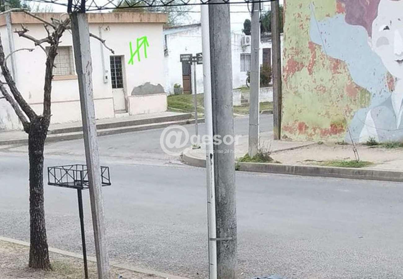 A su vez apareció la misma pintada que consiste en tres rayas paradas y una flecha que las cruza de izquierda a derecha, de abajo a arriba, en todos los casos con pintura en aerosol de color verde claro. En este caso la pintada apareció en un muro que está en la zona de los techos del Liceo 1 "Roberto Taruselli", para lo cual se estima que quien o quienes participaron de ello, habr+ian tenido que llegar al lugar ingresando por finca aledaña.