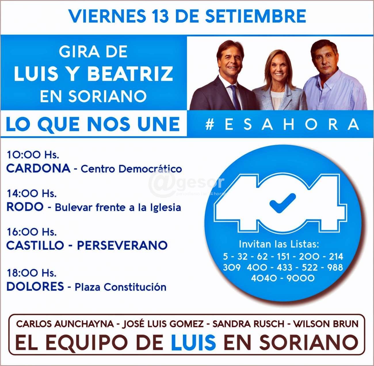 Este viernes 13 gira de Luis y Beatriz en Soriano