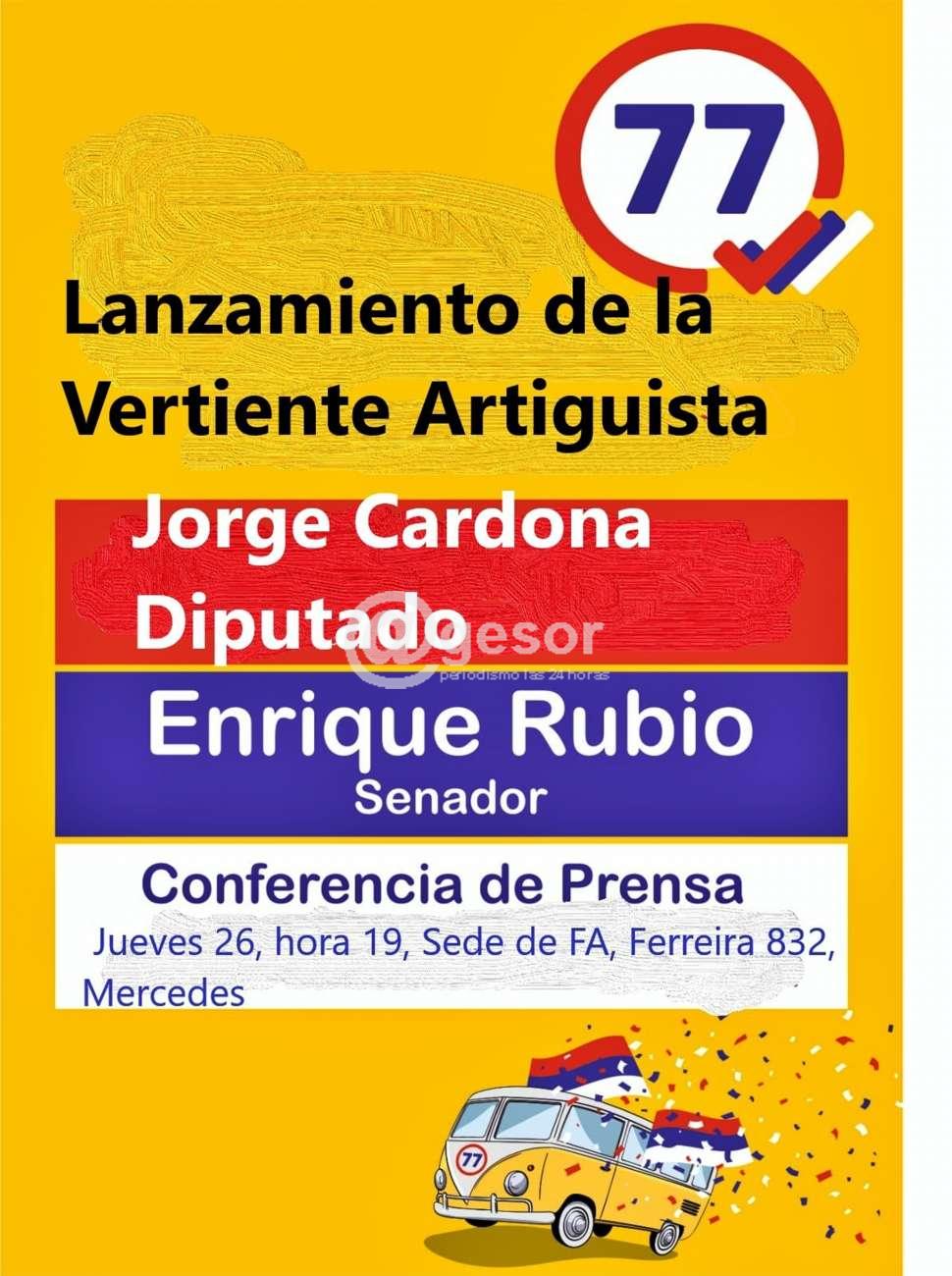 Este jueves 26, en la sede Departamental del Frente Amplio en Mercedes, se realiza el lanzamiento de la candidatura de Jorge Cardona a la Diputación por la Vertiente Artiguista, Lista 77, junto a Enrique Rubio, Senador. La actividad se desarrollará desde las 19.00 horas en el local de Wilson Ferreira Aldunate 832.