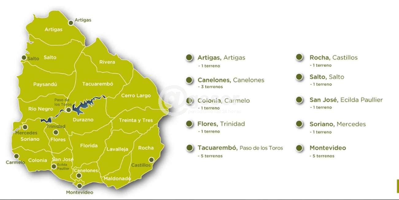 En esta oportunidad, el Mvotma aporta 20 terrenos a disposición de las cooperativas interesadas, en los que se podrán construir 811 viviendas estimadas dependiendo de los proyectos, número que se ajustará de acuerdo a las características de los seleccionados. Estos terrenos están situados en 10 localidades de 10 departamentos. Estos son: Montevideo, Artigas, Canelones, Colonia, Flores, Lavalleja, Rocha, Salto, San José, Soriano y Tacuarembó.