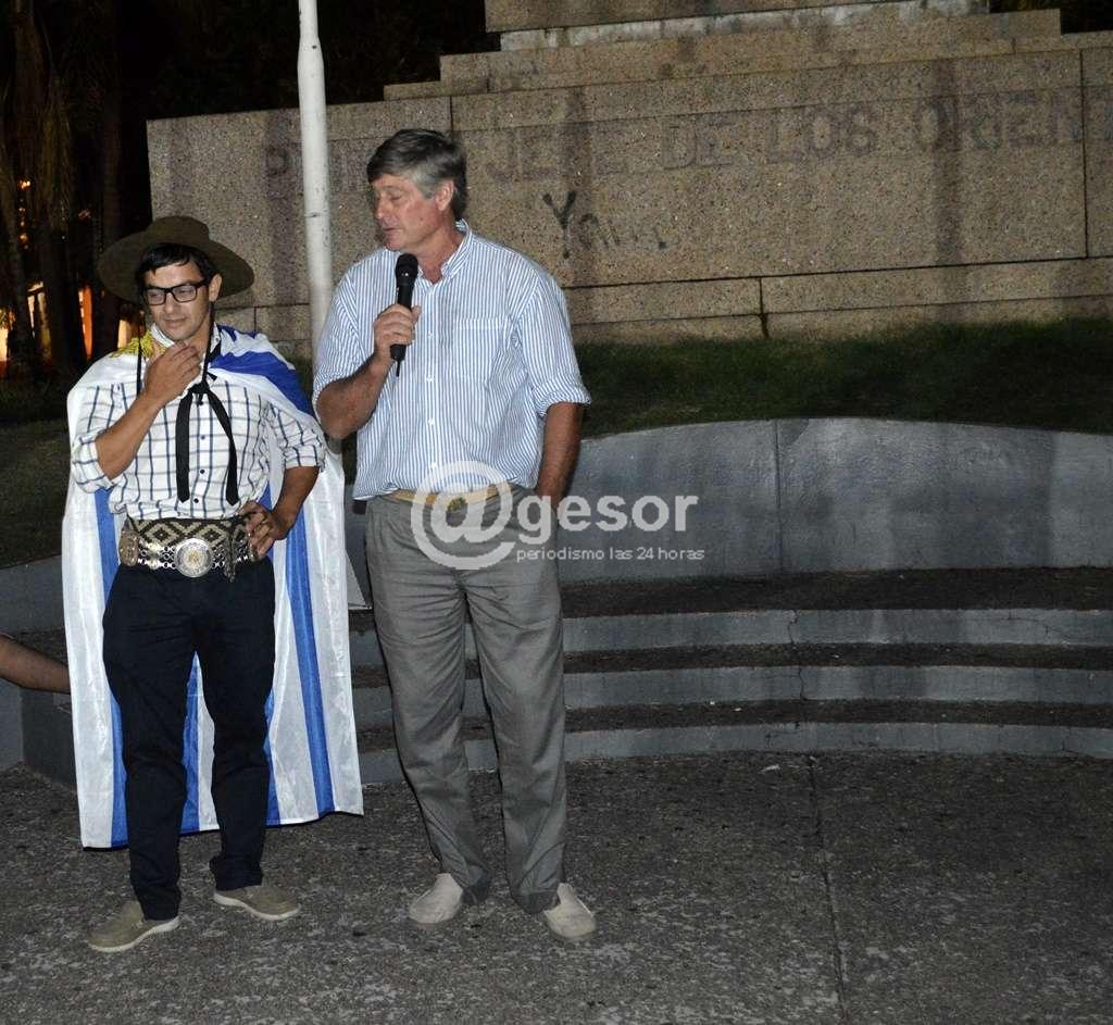 En plaza Artigas en la noche de este lunes luego de entonar las estrofas del himno nacional uruguayo," como muestra de tradición e identidad" según palabras del maestro profesor Oscar Gilardoni Gandolfo conductor de la instancia de homenaje.