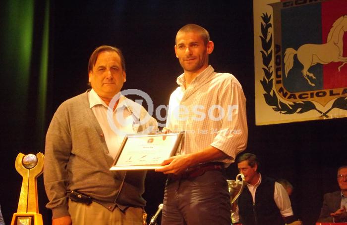 FOTO: El delanrtero Bernardo Golly recibe la plaqueta entregada por el Edil rodoense Luis Agustín Ciganda.