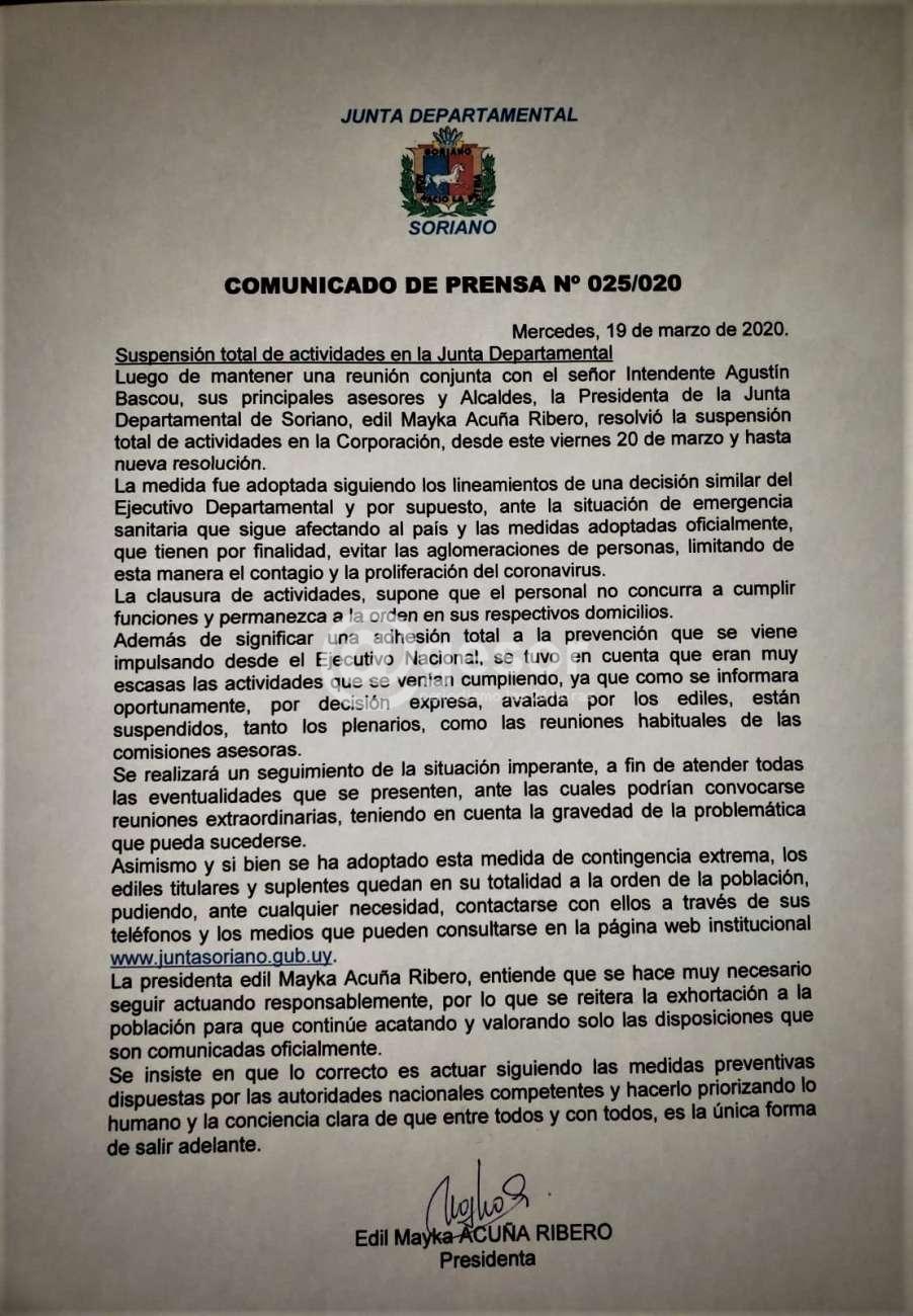 En carta que se adjunta, firmada por la presidente del cuerpo , la edil Mayka Acuña Ribero se dio a conocer la medida.