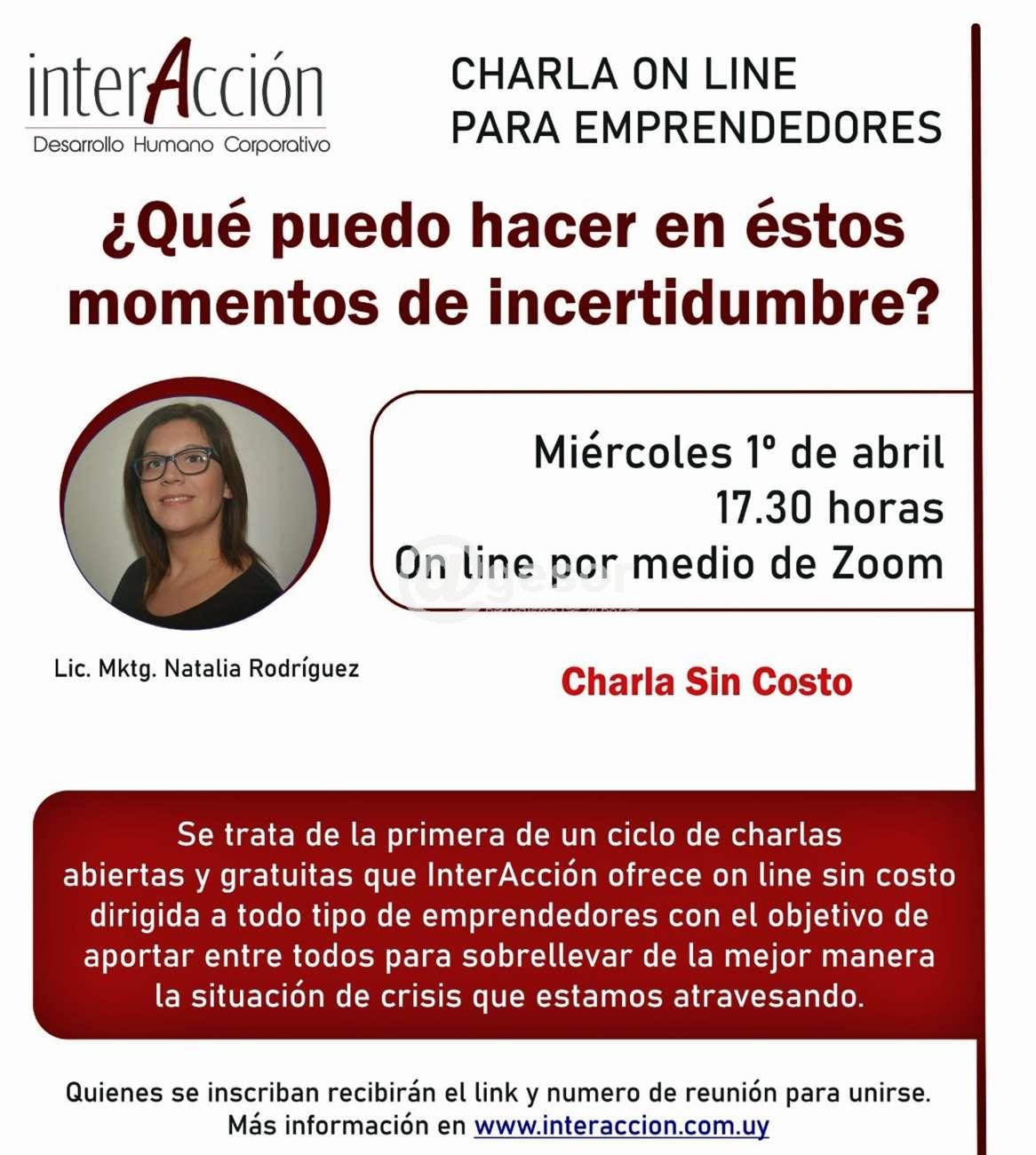 InterAcción ofrece una charla gratuita para emprendedores via on line por medio de la plataforma Zoom. El objetivo es comenzar a compartir breves charlas para intercambiar puntos de vista y opiniones con el objetivo de superar este difícil momento todos juntos.