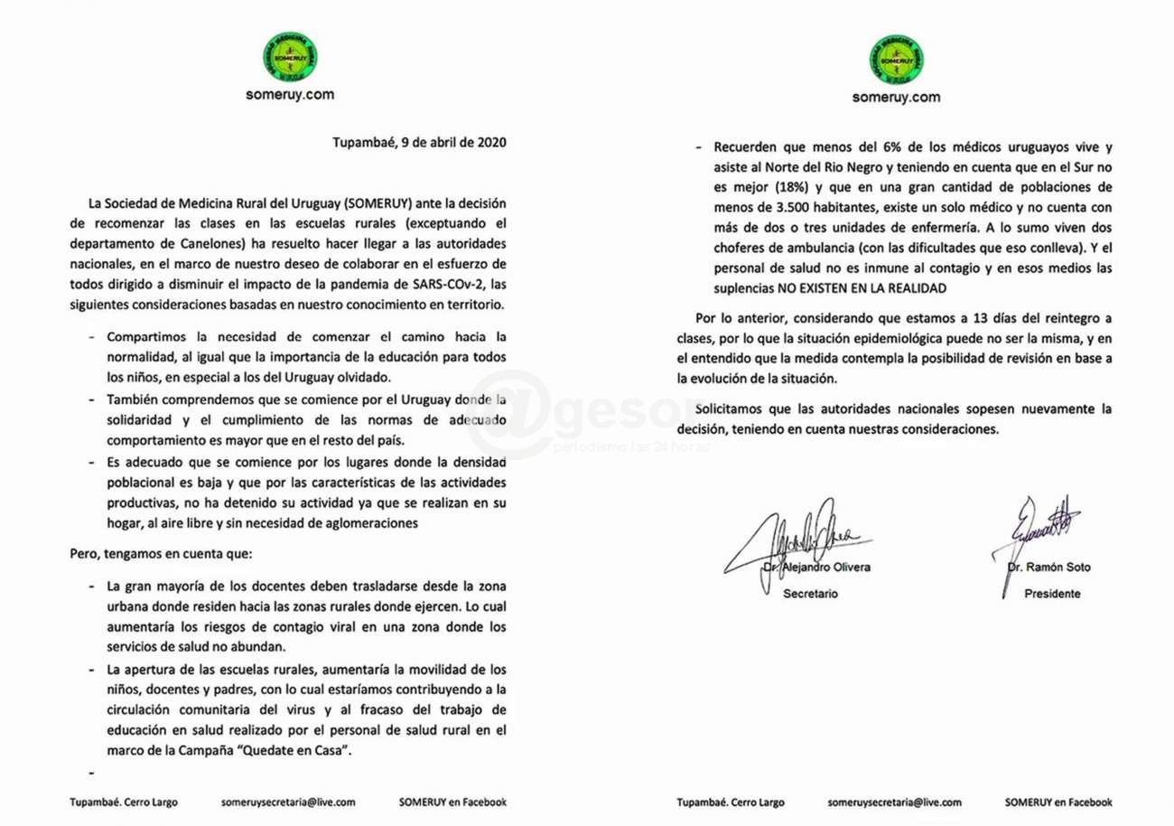 La Sociedad de Medicina Rural del Uruguay (SOMERUY) ante la decisión de recomenzar las clases en las escuelas rurales (exceptuando el departamento de Canelones) ha resuelto hacer llegar a las autoridades nacionales, en el marco de nuestro deseo de colaborar en el esfuerzo de todos dirigido a disminuir el impacto de la pandemia de SARS-COv-2, las siguientes consideraciones basadas en nuestro conocimiento en territorio.
