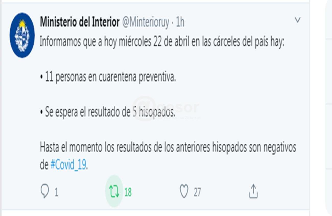 El Ministerio del Interior informó en su cuenta de twitter que a la fecha hay 11 Personas Privadas de Libertad (PPL)en cuarentena preventiva ante casos sospechosos de Coronavirus Covid-19. Que además se espera el resultado de 5 hisopados. Por tanto hasta el momento “los resultados de los anteriores hisopados son negativos”.
