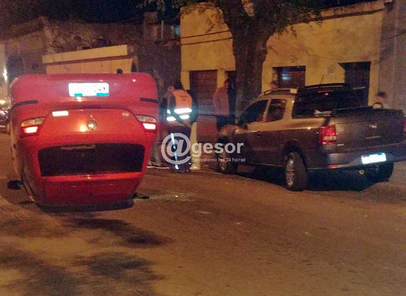 El vuelco de un automóvil ocurrió pasadas las 20.30 horas en avda. Fregeiro entre Oribe e Ituzaingó cuando el vehículo circulaba por la mencionada avenida y en determinado momento al conductor se le cae un elemento y al agacharse a buscarlo y ver que se le iba el vehículo sobre una camioneta estacionada en la que impacta, dio el volantazo y el automóvil giró de tal manera que volcó quedando con las cuatro ruedas hacia arriba, sin que se registrara lesiones en quien iba al mando del coche, aunque si daños en el auto y también en la camioneta, a la que subió una parte a la vereda.