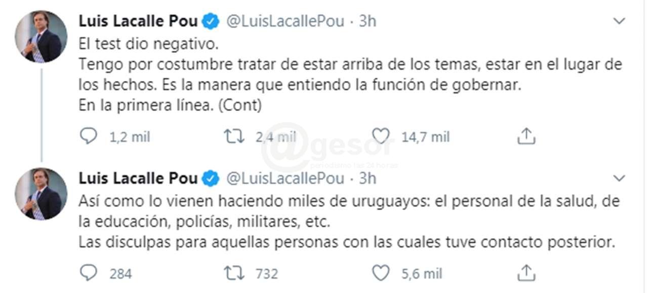 Concretamente Lacalle Pou escribió en su cuenta de twitter: “El test dio negativo. Tengo por costumbre tratar de estar arriba de los temas, estar en el lugar de los hechos. Es la manera que entiendo la función de gobernar.