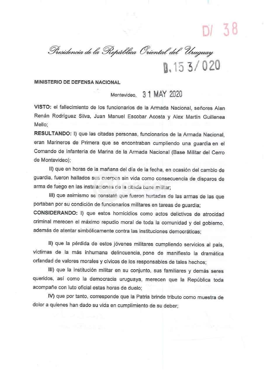 El presidente comenzó su mensaje informando que el Poder Ejecutivo decretó duelo nacional los días lunes y martes en la memoria de los tres marineros que fueron "asesinados cobardemente en las últimas horas", indicó.