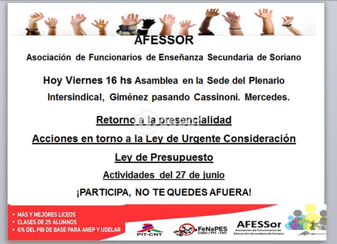 Hoy Viernes 16 hs Asamblea en la Sede del Plenario Intersindical, Giménez pasando Cassinoni. Mercedes.