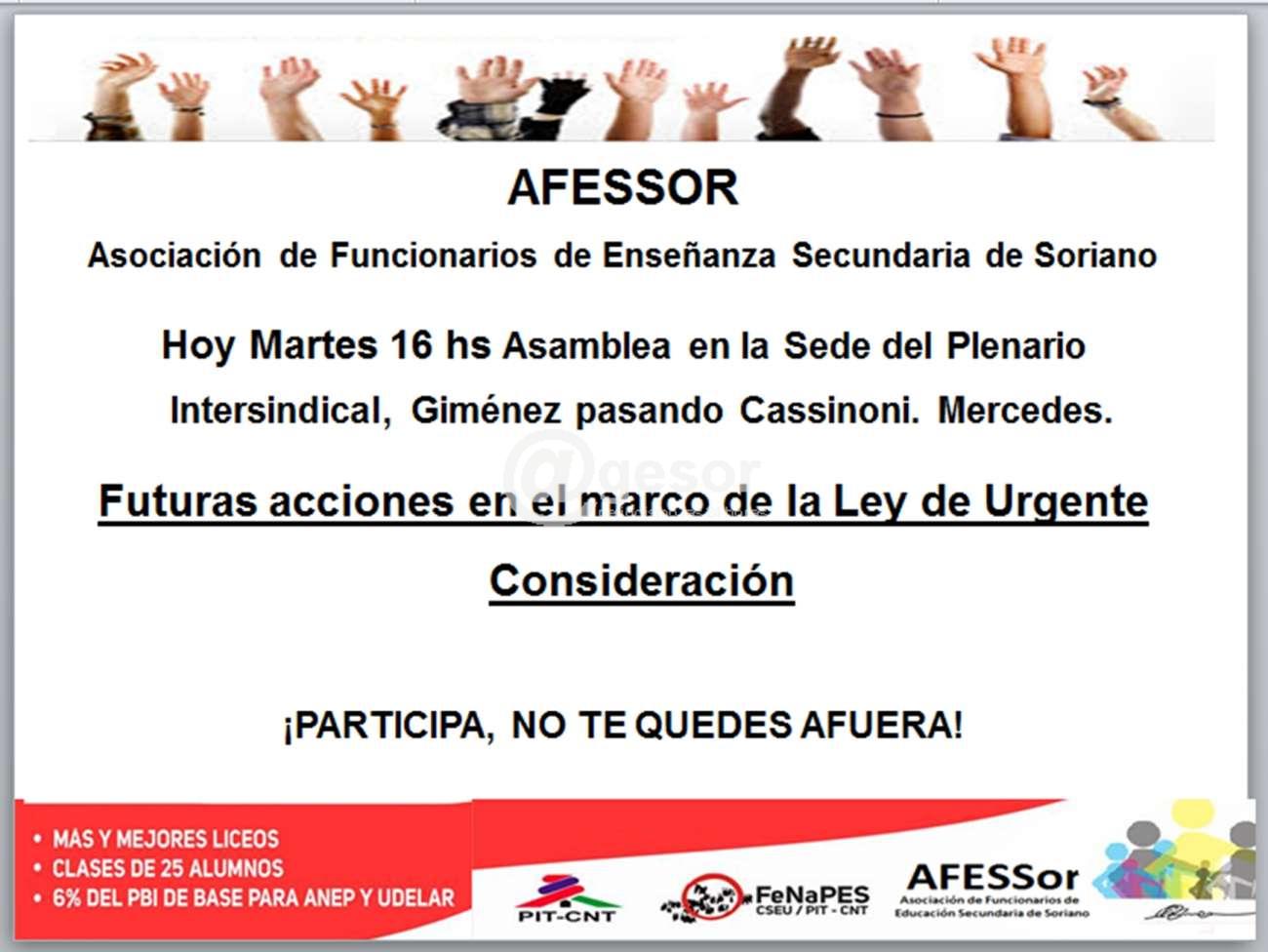 Hoy Martes 16 hs Asamblea en la Sede del Plenario Intersindical, Giménez pasando Cassinoni. Mercedes.