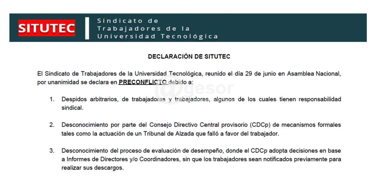 El Sindicato de Trabajadores de la Universidad Tecnológica, reunido el día 29 de junio en Asamblea Nacional, por unanimidad se declara en PRECONFLICTO debido a: 1. Despidos arbitrarios, de trabajadoras y trabajadores, algunos de los cuales tienen responsabilidad sindical.