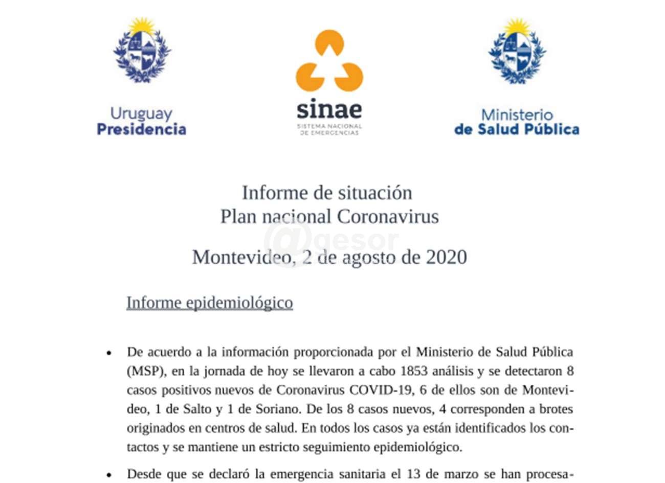 De acuerdo a la información proporcionada por el Ministerio de Salud Pública  (MSP), en la jornada de hoy se llevaron a cabo 1853 análisis y se detectaron 8 casos positivos nuevos de Coronavirus COVID-19, 6 de ellos son de Montevideo, 1 de Salto y 1 de Soriano. De los 8 casos nuevos, 4 corresponden a brotes originados en centros de salud. En todos los casos ya están identificados los contactos y se mantiene un estricto seguimiento epidemiológico.