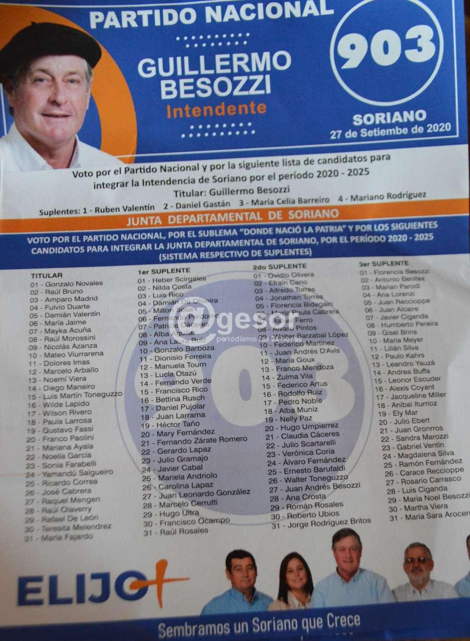 En las primeras horas de la tarde de este viernes, jornada de cierre del plazo para presentar las hojas de votación que participarán de las Elecciones Departamentales y Municipales del domingo 27 de setiembre se presentó la hoja 903 del Partido Nacional que lleva como candidato a la Intendencia de Soriano a Guillermo Besozzi, a la Junta Departamental -como lo adelantara @gesor- está encabezada por el exDiputado Gonzalo Novales, seguido por otro experiente en el Legislativo y a partir de allí si bien hay algún otro integrante actual de la Junta por otra lista, la mayoría es gente joven en la titularidad y con una notoria descentralización, por ejemplo seis de los primeros diez lugares corresponden a titulares del Interior del departamento, a saber: