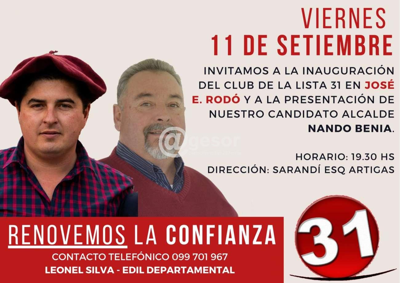 Este viernes la Lista 31, del Partido Colorado, comandada por el edil Leonel Silva inaugurará su local en José Enrique Rodó. Será la oportunidad para presentar públicamente la candidatura de Nando Benia al Municipio de esa lodalidad.