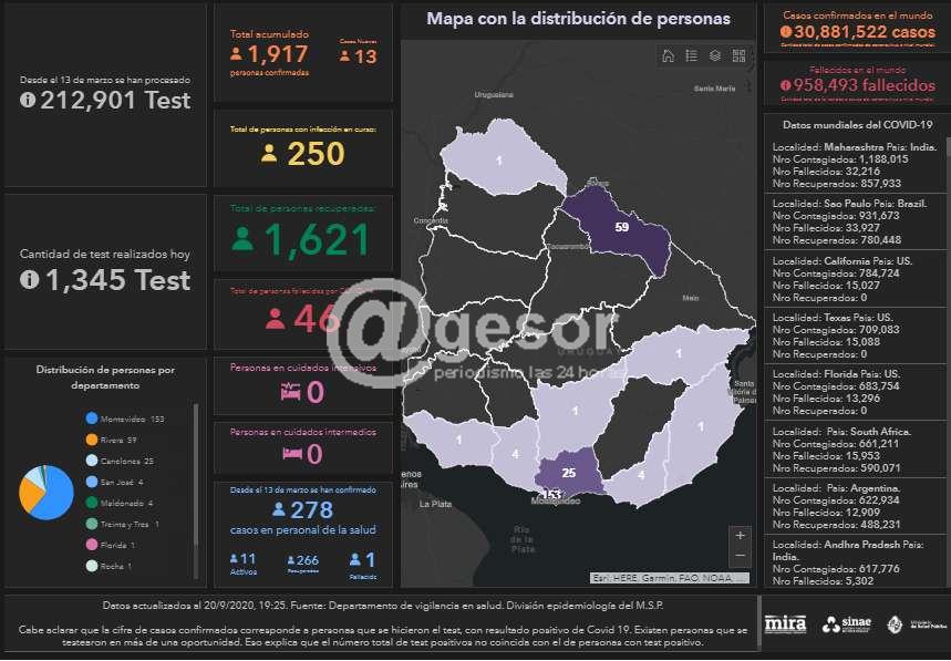 Este domingo 20 se confirmaron 13 nuevos casos de COVID-19. Se realizaron 1.345 análisis, 7 resultaron positivos en Rivera, 5 en Montevideo y 1 en San José. En total son 250 los casos activos en el país.
