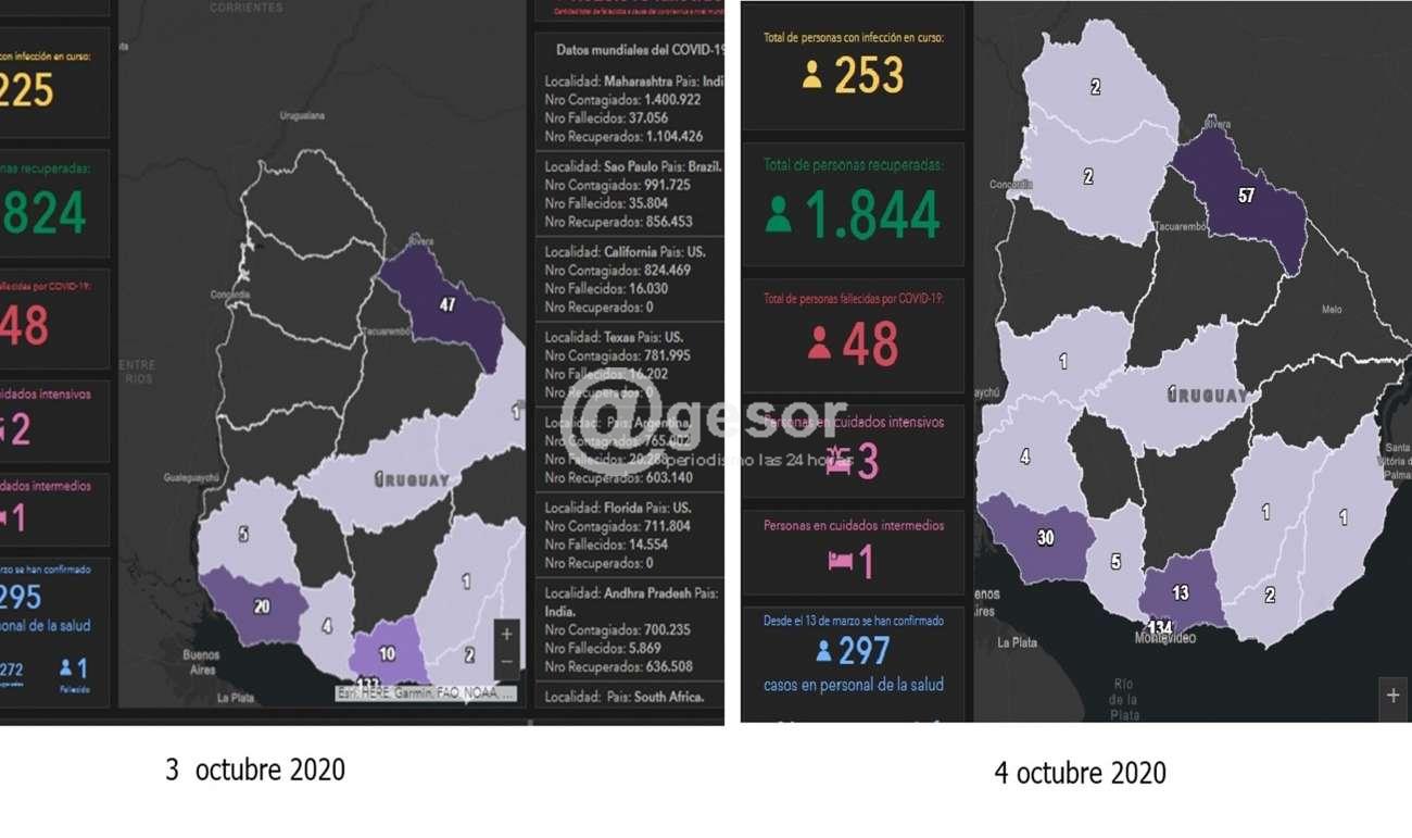 El sábado  3 de octubre el Sinae (Sistema Nacional de Emergencias) informaba que  Soriano tenía  5  casos activos de  Covid-19. Es decir  4 casos  en  Mercedes y uno en Cardona. Sobre el mediodía de este domingo el Cecoed informó textualmente: “El Doctor Sarachaga nos informa: dos personas con test positivos en la ciudad de Dolores, se conoce el nexo, siendo este de Nueva Palmira.