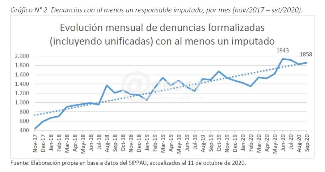 En el informe, elaborado por el director del Departamento de Políticas Públicas, Sebastián Pereyra, se destaca que en el mes de setiembre se registró "un nuevo máximo histórico de imputaciones a personas, llegando a 1.697".