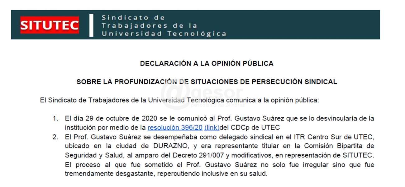 - El Prof. Gustavo Suárez se desempeñaba como delegado sindical en el ITR Centro Sur de UTEC, ubicado en la ciudad de DURAZNO, y era representante titular en la Comisión Bipartita de Seguridad y Salud, al amparo del Decreto 291/007 y modificativos, en representación de SITUTEC. El proceso al que fue sometido el Prof. Gustavo Suárez no solo fue irregular sino que fue tremendamente desgastante, repercutiendo inclusive en su