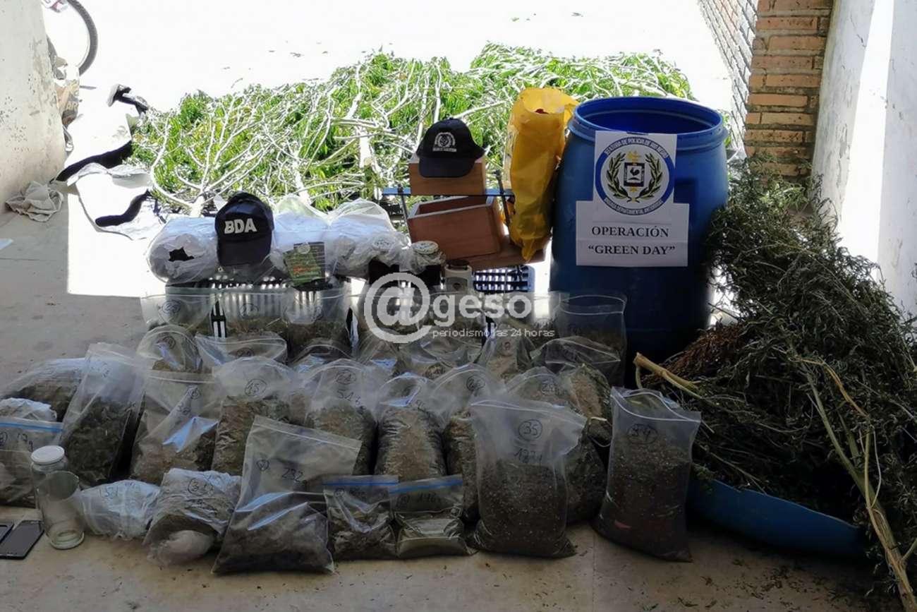 Desde un galpón que se encontraba en dicho predio se incautó una tarrina conteniendo sustancia vegetal, una prensa de madera y un envoltorio conteniendo semillas de cannabis sativa. A su vez, del interior de la vivienda se incautaron cuatro ladrillos prensados, varios envoltorios de sustancia vegetal y dos celulares.