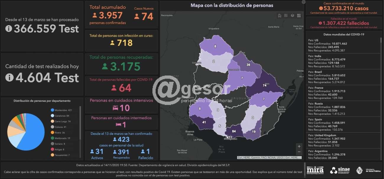 Desde que se declaró la emergencia sanitaria el 13 de marzo se han procesado 366.595 tests y se han registrado 3957 casos positivos de Coronavirus en todo el territorio nacional. De ese total 3175 ya se recuperaron y 64 fallecieron.