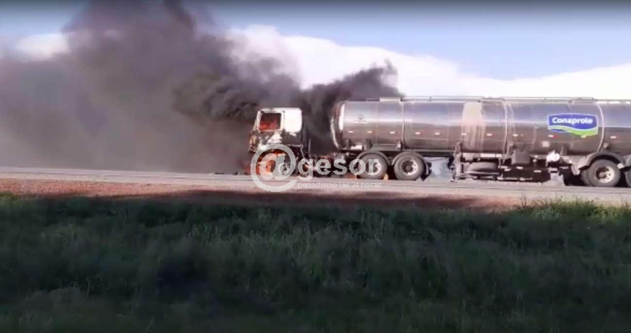 Un camión  de transporte de leche  tomó fuego en ruta  2  cerca de  Palmitas. Este siniestro se produjo a  la altura del  kilómetro  235 de dicha ruta,  donde  afortunadamente  no se registraron personas lesionadas.