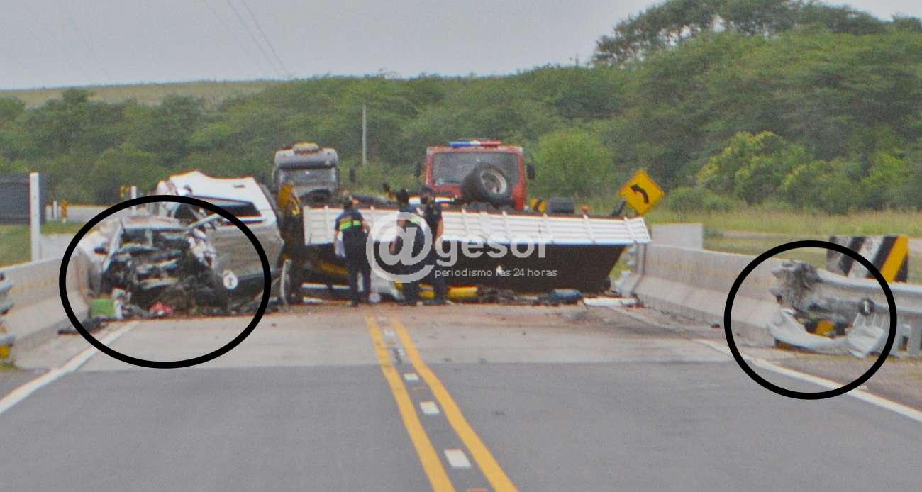 En la fotografía se aprecia el punto de choque del camión en la zona de acceso al puente sobre la derecha y el punto de contacto con la camioneta, sobre la izquierda.