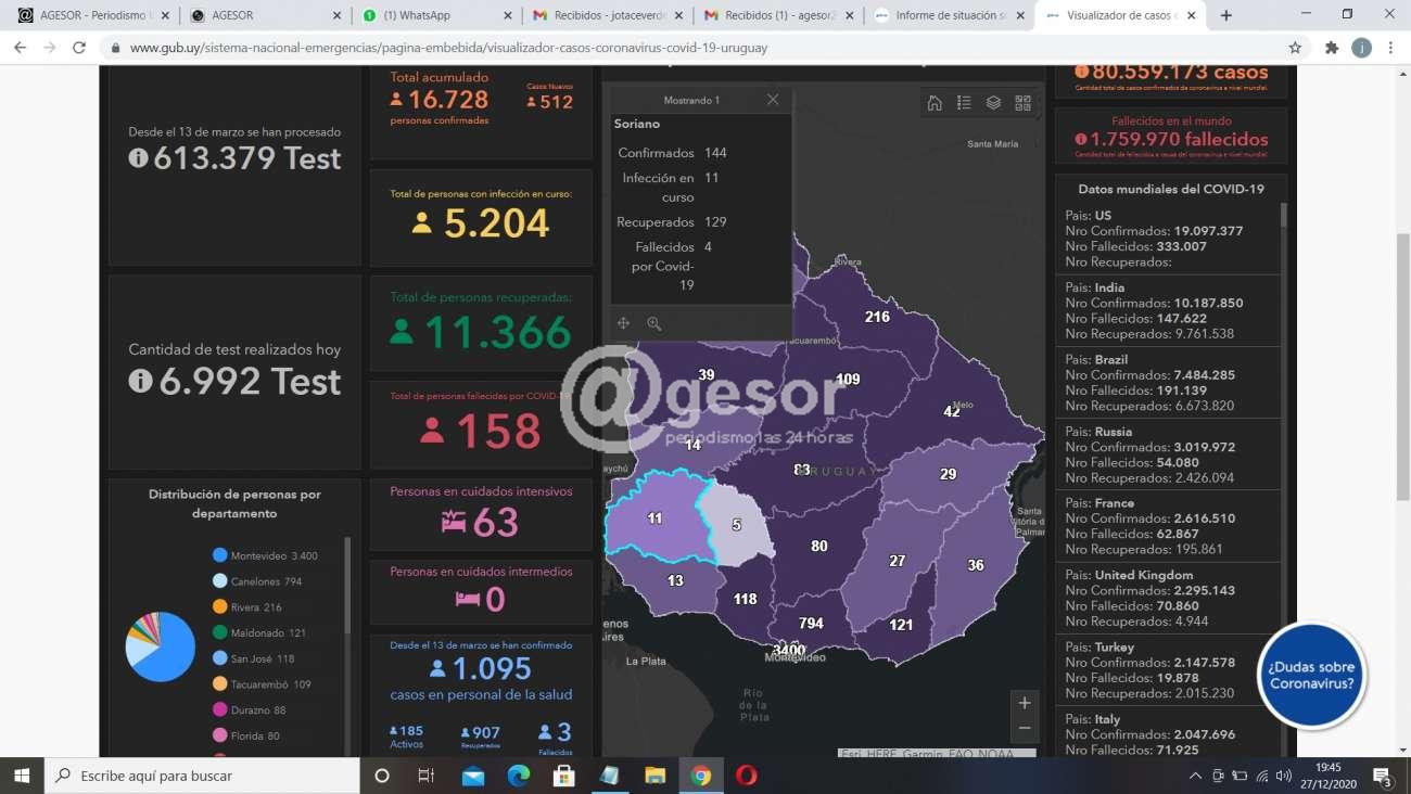 En lo que respecta a Soriano, teniendo en cuenta que se detectó un caso nuevo, y a la vez, como informamos por separado se dio el fallecimiento de paciente de Risso que se encontraba internado en Sanatorio de CAMS Mercedes, y que no hubo personas recuperadas, el total de casos confirmados desde que se inició la pandemia el 13 de marzo pasó a 144, mientras que los activos se mantuvieron en 11, los recuperados son 129 y los fallecidos pasaron a ser 4.