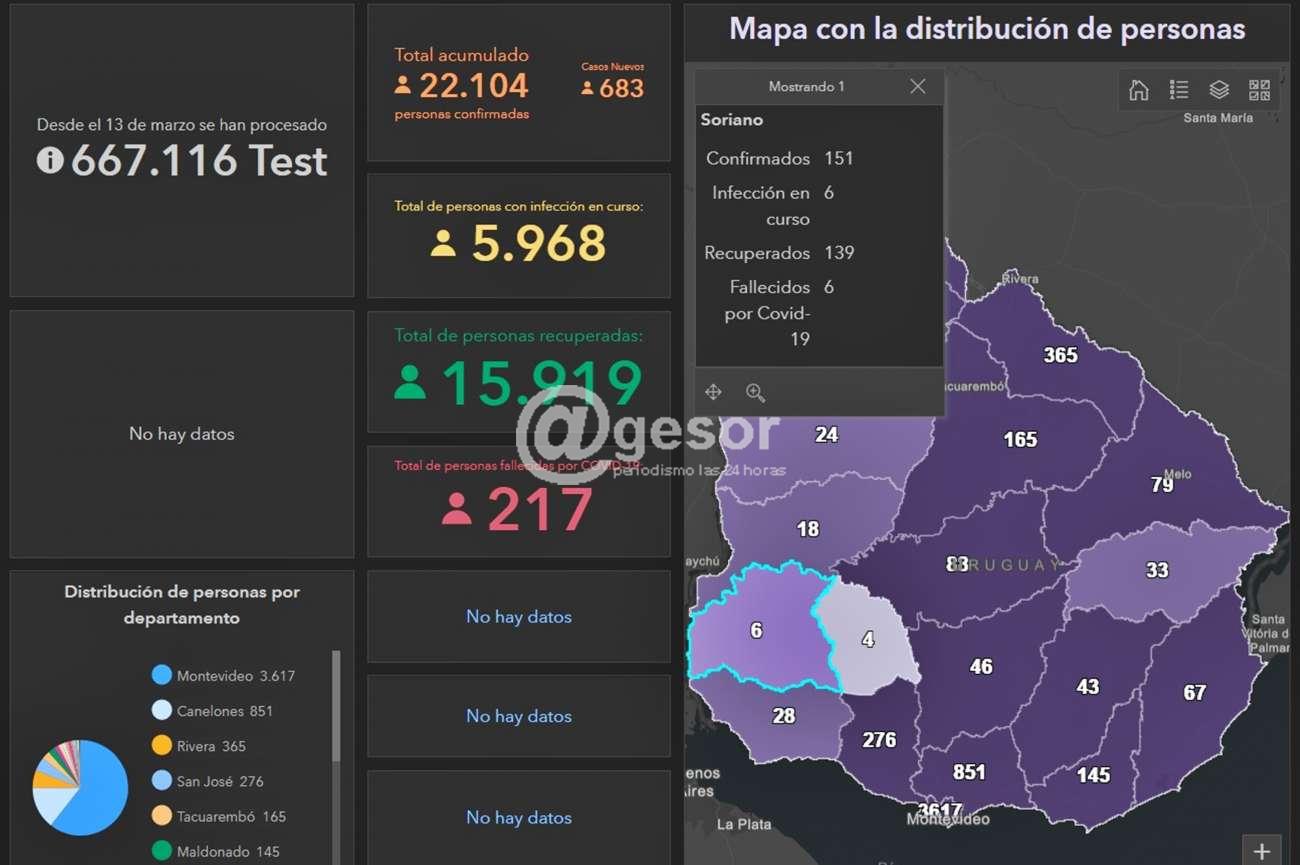 En Soriano como se registró un caso nuevo y a su vez se dio por recuperada a una persona, la cantidad de activos se mantuvo en 6, el total de casos confirmados desde que se inició la pandemia el 13 de marzo pasó a ser 151 y las personas recuperadas son ahora 139, mientras que las fallecidas son 6.