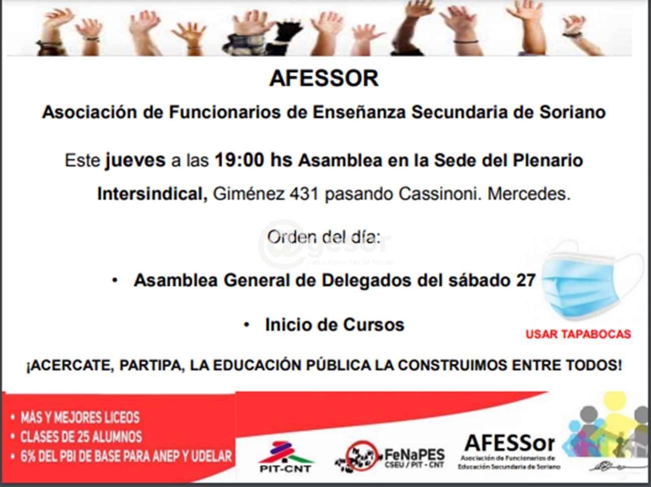 Este jueves a las 19:00 hs Asamblea en la Sede del Plenario Intersindical, Giménez 431 pasando Cassinoni. Mercedes.