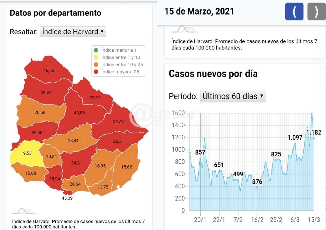Este lunes el mapa del Uruguay se tiño de rojo y naranja tras cinco días seguidos, donde los casos positivos de Covid-19 superaron el millar a nivel nacional. El índice Harvard a nivel nacional en esta jornada se ubica en 33,51. Es decir 33 personas contagiadas cada 100 mil habitantes.