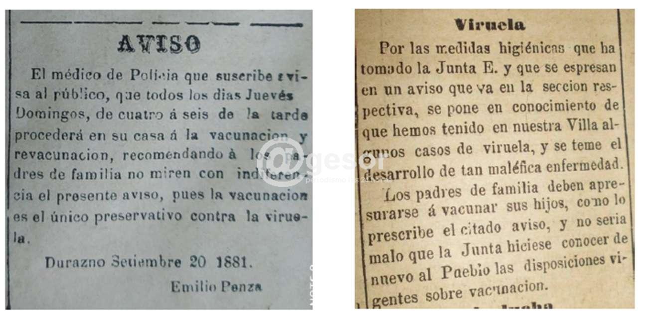 Los médicos suministraban entonces la vacuna contra la temida viruela en sus propios domicilios, como lo señala este registro de la prensa: “Aviso. El médico de Policía que suscribe avisa al público, que todos los días Jueves y Domingos, de cuatro a seis de la tarde procederá en su casa a la vacunación y revacunación, recomendando a los padres de familia no miren con indiferencia el presente aviso, pues la vacunación es el único preservativo contra la viruela. Durazno, Setiembre 20 de 1881.Dr. Emilio Penza”.