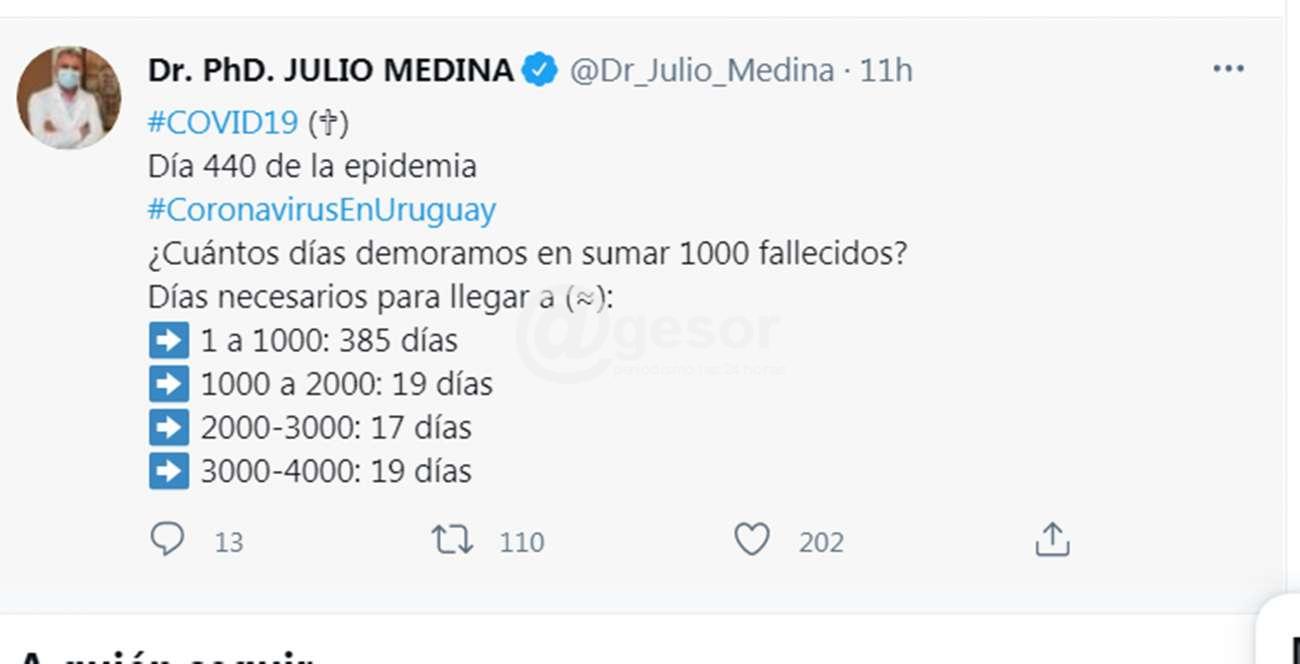 Julio Medina, Prof. Director de la Cátedra de Enfermedades Infecciosas (Udelar)   graficó en  su cuenta de  twitter  la  evolución de la letalidad que  viene  teniendo el Coronavirus en nuestro país.   Mientras  transcurrió un año entre que se registró  la primera muerte por Covid-19  y  los mil casos  fatales,  el avance de la enfermedad   viene resultando tan devastador, que entre los mil  y los dos mil casos  transcurrieron  solamente  19 días, y así sucesivamente hasta llegar a los  4 mil casos  fatales.