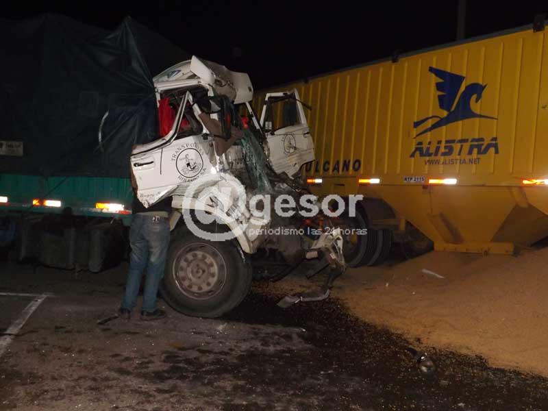 (por Martín Corujo) Justo donde se encuentra la rotonda que une las rutas 2 y 24, se registró un fuerte impacto entre dos camiones, con el saldo de un hombre lesionado que experimentó heridas de consideración. Por ruta 2 al sur se dirigía el camión de la empresa maragata Transportes Rolando, cargado con material de yeso, matrícula LTP 1819, conducido por el joven José Reyes de 24 años.