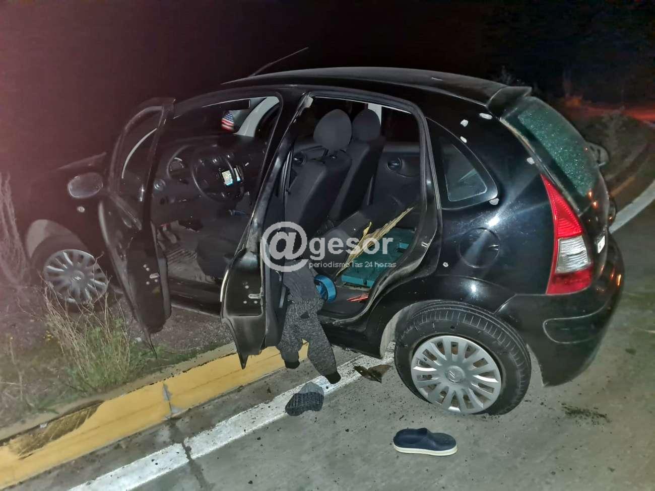 Próximo a la hora 21 y 30 los ahora detenidos detectaron dicho control y comenzaron a efectuar maniobras evasivas, tomando marcha atrás e impactando otro vehículo, para luego desviarse y dirigirse directamente contra los efectivos policiales, arrojando el vehículo finalmente hacia donde estaban los mismos, cayendo al pavimento del Oficial A., y tirándose también al pavimento el Oficial N.Q. para evitar ser embestido, provocando dicho accionar de fuga que otros efectivos dispararan en dirección a las ruedas del vehículo para lograr que se detuviera, culminando la persecución en la Rotonda ubicada sobre la Ruta 2 km. 181, luego de que el conductor intentara evadirla y colisionara contra el cordón al perder el control del vehículo, resultando ser el mismo J.C.C.T. y su acompañante J.F.G.F., este presentó una herida de arma de fuego por lo cual fue trasladado rápidamente al Hospital de Cardona, donde se le diagnosticó "Herida de arma de fuego en hombro izquierdo, proyectil subcutáneo, que se extrae. Sin lesiones internas, sin riesgo de vida. Debe curarse diariamente", disponiendo el alta en el lugar.