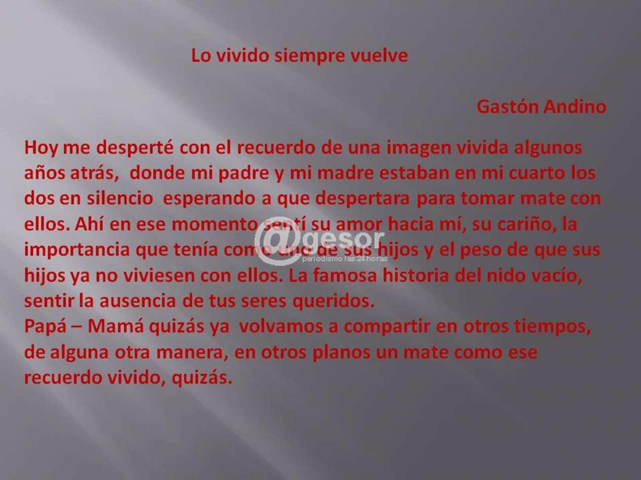 "Hoy me desperté con el recuerdo de una imagen vivida algunos años atrás, donde mi padre y mi madre estaban en mi cuarto los dos en silencio esperando a que despertara para tomar mate con ellos. Ahí en ese momento sentí su amor hacia mí, su cariño, la importancia que tenía como uno de sus hijos y el peso de que sus hijos ya no viviesen con ellos. La famosa historia del nido vacío, sentir la ausencia de tus seres queridos.