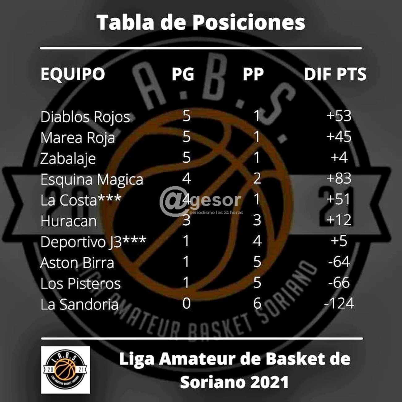 Culminada la sexta fecha del torneo de la Liga Amateur de Basket que viene disputándose en el gimnasio "Mario E. Bellini" del Club Remeros Mercedes y que este domingo 22 llevó adelante esta nueva jornada, con los resultados que informamos al momento que iban sucediendo, la tabla de posiciones de esta etapa clasificatoria a la siguiente fase, tiene ahora tres líderes: Diablos Rojos, Marea Roja y Zabalaje, todos ellos con 5 partidos ganados y uno perdido, cabe señalar que el equipo La Costa tiene pendiente de jugar un encuentro ante J3 de Fray Bentos que no se disputara por condiciones atmosféricas y que se tomó la previsión de no hacer viajar a los fraybentinos, que en caso de ganarlo La Costa también se sumaría a los líderes, ya que hoy tiene 4 juegos ganados y uno perdido.