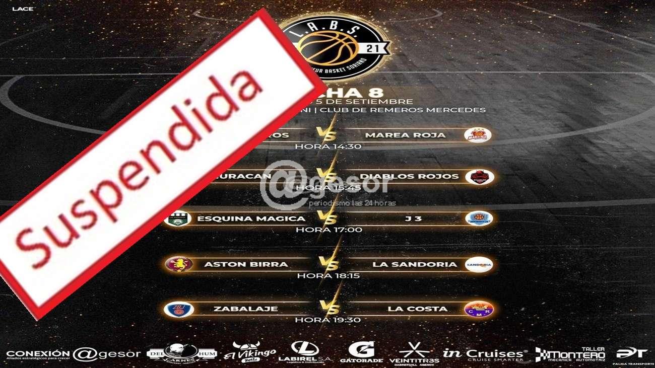 La organización de la Liga Amateur de Basket decidió suspender la programación de la 8a. y penúltima fecha del torneo que se disputaría  este domingo 5 de setiembre en el gimnasio "Mario Bellini" del Club Remeros Mercedes.
